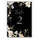 Elegant black and white wedding table number depicts a beautiful romantic floral design with simple white flowers on a black background. Make a separate card for each table number.