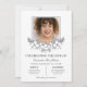 Floral memorial service or funeral invitation, featuring a photo of your loved one framed by a half wreath of white flowers and greenery.