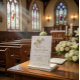 The crispy white background enhances the luxurious gold foil details while the floral composition adds a quiet sense of dignity and remembrance. This invitation offers a timeless and tasteful way to share the details of a memorial gathering while honoring the memory of a loved one.