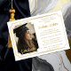 Elegant white graduation party invitation featuring a refined scalloped photo panel on the left and personalized event details on the right, all framed by a genuine gold foil double scalloped-edge border. This landscape-oriented foil invitation offers a timeless, sophisticated look ideal for celebrating high school, college, or university graduates. Fully customizable with the graduate’s photo, name, degree, date, and event details, this polished design creates a memorable keepsake for honoring an important milestone. Composite design by Holiday Hearts Designs (rights reserved).