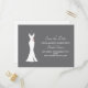 Bridal shower save the date postcard set on a classy grey background. Designed with an elegant white gown hanging from a hanger. Simple minimalist design.