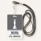 Name badge made with a classy grey background. A graphic illustration of an elegant white gown hanging on a hanger. Simple minimalist design.