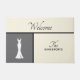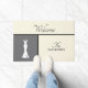 A graphic illustration of an elegant white gown hanging on a hanger. Simple minimalist design.