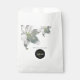 This design features white lily flowers. The beautiful elegant white lilies compliment the elegant black modern circle shape encircling the wedding date. A perfect fusion of modern and chic with green colour tones. Green, black and white are a perfect match for an elegant floral garden themed wedding. Unique wedding favour bag design with modern elements. Matching wedding invitations and other stationery items are also available.
