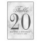 features title "Table" in grey elegant script font style with large table number and wedding details in grey serif font style on white marble background.