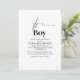 Classy, modern, and oh-so-chic! This minimalist "It's a Boy" baby shower invitation is perfect for those who love timeless elegance. Designed with a sleek black-and-white aesthetic, it adds a touch of sophistication to your celebration. Whether you're hosting a brunch or an intimate gathering, this invite sets the perfect tone.