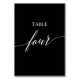 This elegant white on black calligraphy table four table number is perfect for a simple wedding. The neutral design features a minimalist card decorated with romantic and whimsical typography. The card prints on the front and back (double-sided). Other table numbers in the collection are sold separately.