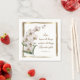 Inspirational scripture wedding napkin depicts a simple watercolor floral design with elegant white orchids and a gold frame. It features Bible Verse 1 Corinthians 13:7-8, "LOVE… hopes all things, endures all things, LOVE never fails."
