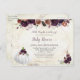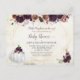 Send this elegant, autumn, floral baby shower with white pumpkin. Pumpkin sits on lower left on top of rose gold geometric frame. Floral colorations are purple, orange, pinks and reds. Florals include green/white feathers for a modern vintage, bohemian vibe. Templates provided on both front and back.