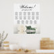 This beautiful wedding seating chart has 17 tables and an exquisite design that showcases a solitary long stemmed ivory, white, or cream coloured rose lying horizontally, reflecting on a pool of water. The title is written in fancy script calligraphy and says "Welcome!" with the couple's names and wedding date at the bottom. The seating arrangement has a traditional layout that accommodates 170 guests with 10 seats per table. This romantic, elegant, and stunning seating chart is a lovely gesture to greet your wedding guests and help them find their seats with ease at the reception.