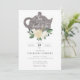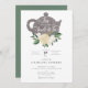 Bridal shower teatime becomes an elegant event with white roses and green foliage. Teapot in a bed of ivory and white roses; mixed media in colours of taupe, ivory, and forest green. Reverses to an understated leaf green texture centred with white roses and gold accents.