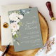 With a popular colour scheme white florals on a sage green background, this wedding invitation design pops with style and charm. It features a cascading corner bouquet of white watercolor florals with trailing greenery. The flowers include roses, hydrangeas and matching mixed florals for a lovely effect. The text pairings used in this design feature the bride and groom's names prominently using a handwritten type face. Personalize the easy-to-use text template with your wedding details.