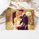 Simple and stylish wedding thank you card template features a horizontal / landscape photo with "Thank You" script overlay in white, and a custom message from the bride and groom on the inside that can be personalized.