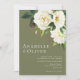 An elegant olive green wedding invitation features a watercolor arrangement of white florals with assorted greenery. Personalize all the important details including bride and groom name, wedding date and location.