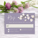 With modern charm and elegance, this wedding response card design features a neutral colour scheme with white florals in soft watercolor white and off-white with trailing greenery over a popular lavender purple background. The front of the design has a sprig of small white blossoms and the back includes a beautiful bouquet of white roses and hydrangea with other mixed blossoms. This design is a lovely choice for spring and summer weddings. Personalize the text template with your required response date.