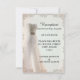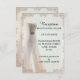 An elegant white wedding reception card with wedding dress and ornate border. This reception card is part of a complete set.