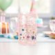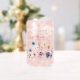 Pretty wildflowers decorate the bottom of this colorful spring wedding can glass for reception table decor. Watercolor floral borders are perfect for a garden ceremony outdoors while flowers are in bloom. Elegant script dances above a beautiful orange, purple, yellow, and blue botanical meadow on this custom favor.