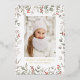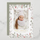Elegant holiday card featuring your vertical photo surrounded by a border of red watercolor holly berries, eucalyptus leaves, and lush sage green foliage. Personalize the front of the botanical Christmas photo card with a custom greeting and your family name in gold foil lettering. The card reverses to display your custom message in white lettering with a dark sage background.