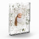 Elegant holiday photo block featuring your vertical photo framed in white with a background of watercolor snowberries, holly, eucalyptus leaves, and lush sage green foliage. Personalize the botanical Christmas photo block with a custom greeting and your family name in sage green lettering.