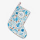 Decorative watercolor blue winter patterned Christmas stocking with elegant monogrammed wreath.