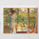This design features original artwork by the American impressionist painter Childe Hassam (1859–1935). It depicts a woman standing beside an open window; she is wearing an elegant white dress. Beside her is a table with a bowl of red goldfish swimming around in water; their red scales are lit up in the sunlight. There is a beautiful garden of verdant foliage in the background outside the window. The original art was painted in 1912.