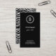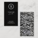 This elegant design with black background (front and back) and white text features a white circle at the top for your initial/monogram. Customize to add/remove fields or adjust alignment of monogram as needed. Dark background colour can be changed as desired. Zebra print on back