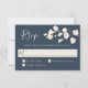 Avec un charme et une élégance modernes, cette carte de réponse mariage offre un jeu de couleurs neutres avec des fleurs blanches dans une couleur douce blanc et blanc cassé avec une verdure sur un arrière - plan bleu marine populaire. L'avant de la conception a une branche de petites fleurs blanches et l'arrière comprend un beau bouquet de roses blanches et d'hydrangée avec d'autres fleurs mixtes. Ce design est un très bon choix pour les mariages du printemps et de l'été. Personnalisez le modèle de texte avec la date de réponse requise.
