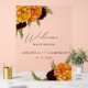 Il dispose d'un panneau acrylique clair avec un design floral dynamique et automnal. Les oeuvres d'art présentent des marigolds riches en aquarelles dans les tons jaune et orange, magnifiquement contrastés avec des fleurs bordeaux profondes et des feuillages verts luxuriants. Le panneau est personnalisé avec un texte et un script élégants, lisant "Bienvenue à Notre Mariage", ainsi que les noms du couple et la date du mariage. Il est exposé sur un chevalet rose aux tons or, lui donnant une présentation moderne et sophistiquée. Cette enseigne est idéale pour les couples à la recherche d'une décoration mariage sur le thème du jardin automnale, rustique-chic ou élégante.