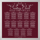 Faites de votre réception de mariage une belle avec ce tableau de sièges. Conçu dans le cadre de notre suite de mariage sobre et bourguignonne, il présente un design simple et élégant avec du gris sur un arrière - plan rouge ou bordeaux avec une bordure florale en faux feuille d'argent. Ce graphique montre les affectations de table pour 14 tables afin que vos invités aient un temps facile à trouver la bonne table.
