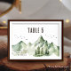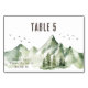 Cette carte de numéro de table est élégante et très utile pour aider les clients à savoir où s'asseoir. Conception de l'aquarelle paysage peinture d'arbres, oiseaux volants et montagnes dans l'arrière - plan. Illustration nature calme et sereine avec pins et silhuettes d'oiseaux volants. Ajoutez les noms de la mariée et du marié et la date du mariage.