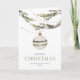 Cette élégante carte de Noël présente un design minimaliste avec un unique ornement argenté accroché sous la verdure. Les branches délicates et les tons feutrés lui confèrent une atmosphère sophistiquée et festive. "Joyeux Noël" est imprimé en lettres élégantes, créant un accueil chaleureux et accueillant.