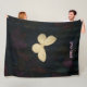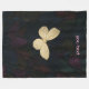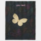 L'image montre une couverture tissée avec un grand papillon doré au centre sur un arrière - plan texturé foncé aux subtiles nuances de violet et de bleu. La couverture a des arêtes frangées et inclut le texte de l'espace réservé personnalisable "vous texte" en rose sur le côté.