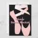 Invitation récital de danse de ballet élégant, fait en noir, avec des graphiques d'une silhouette rose de chaussures pointes, sur le devant de l'invitation. Le dos est fait en noir également, avec des graphiques d'un joli ruban rose et arc, en haut, et le texte rose personnalisé. Personnalisez tout le texte, avant et arrière, pour répondre aux besoins de votre studio de danse.