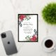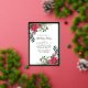 L'élégante invitation à la fête de Noël présente deux ressorts fleuris qui ornent un cadre en feuille d'or. Les sprigs ont des roses rouges, des fleurs de coton blanc, des sucres de canne, des pins et des verdure sainte.