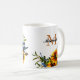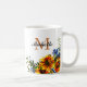 Belle, Boho Girly Yellow Sunfloral personnalisé nom monogramme mug. Fleurs de soleil boho élégantes et fleurs bleues avec plumes design sur arrière - plan blanc. Personnalisez avec votre nom et monogramme initial avec une élégante typographie manuscrite. Si vous avez besoin d'aide ou d'articles correspondants, s'il vous plaît écrivez-moi.