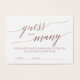 Ces élégantes calligraphies en or rose devinent combien de cartes de baisers sont une activité amusante pour une douche nuptiale d'automne. Remplissez un bocal avec Hersey's Kisses et demandez à vos invités de deviner combien de bonbons sont dans le bocal. La réponse la plus proche gagne un prix ! Le design rose vif présente une carte minimaliste ornée d'une typographie romantique et fantaisiste en feuille d'or rose. Remarque : Ce design ne présente pas de véritable feuille d'or rose. C'est un graphisme de haute qualité fait pour ressembler à du papier doré rose.