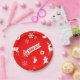 A white seamless repetition of Christmas elements - stockings, gingerbreadman, snowflakes, reindeer, Christmas ornaments, candles, Christmas tree, and the words "Merry Xmas" - in illustration, against a red background.