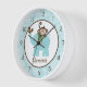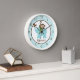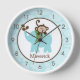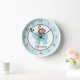 This clock features our original monkey and blue elephant illustration with a giraffe pattern border in light blue. The numbers are printed in dark brown. The inside circle is brown. This jungle themed clock would look great in a baby nursery, child's bedroom, or a playroom.