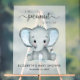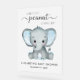 A cute frosted acrylic baby boy shower welcome sign featuring "A Sweet Little Peanut Is On His Way" written in a mixture of soft grey typography and a stylish script with swashes and a pastel blue watercolor of a baby elephant. Personalize with the mother's name and baby shower date in simple grey typography.