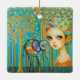 A stylized, colourful elephant stands next to a girl with large eyes and a whimsical, patterned hat. Bright, dotted trees and vibrant vertical stripes fill the background with a sense of fantasy and wonder. Digital Art Photoshop CS5