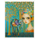A stylized, colourful elephant stands next to a girl with large eyes and a whimsical, patterned hat. Bright, dotted trees and vibrant vertical stripes fill the background with a sense of fantasy and wonder. Digital Art Photoshop CS5