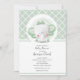 Unisex baby shower invitations with an adorable baby elephant, sporting a jaunty little mint bow on its head against a mint and white diamond pattern background. MATCHING items in our store.