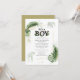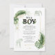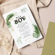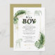 Wild forest themed giraffe, and elegant boys safari animal baby shower invitation featuring a giraffe, an elephant, gold foil and green leaves. Perfect for a boy's baby shower invitations