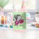 Side profile of an elephant with the trunk up. Fuchsia lotus flowers and henna against backdrop of green.