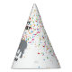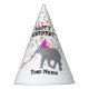 A cute illustration of an elephant partying and having fun! Elephant wearing a party hat and blowing party horn with confetti raining down on it. Let the celebrations begin! Perfect for anyone who loves funny animal illustrations. Ideal birthday party hat. Customize the occasion and name and make it your own.