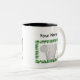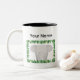 Sip your favourite morning beverage in a personalized mug. A sturdy grey elephant is placed in the "jungle" with leaves all around it. Fill in your name in the customized text boxes. Great for gifts.