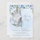 Baby shower d'éléphant garçon avec un petit éléphant mignon avec la couronne prince et le tronc sur un arrière - plan bleu aquarelle. Cette invitation à baby shower d'éléphant mignon est facilement customisée avec vos détails d'événement dans le style de police que vous préférez.