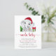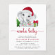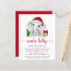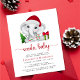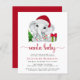 Cute budget-friendly Christmas holiday season merry little baby boy shower invitation with "Santa Baby" in a stylish red script with swashes, a watercolor of a baby boy elephant wearing a Santa hat with a Christmas tree, a red and green candy cane and presents, the mother-to-be's name in elegant red typography and the shower details in simple modern typography.