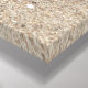 A close-up photograph shows an elephant seal sleeping peacefully on a sandy beach. The seal's eyes are closed, and its wrinkled, brown skin is visible in detail. The sand is a light beige colour, blending with the seal's natural tones. The image captures a serene and tranquil moment in the animal's natural habitat.
