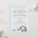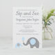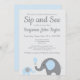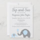 Invite your guests to your elephant themed Sip and See with our adorable, blue and grey elephant invitations. The elephant is holding a festive balloon over a subtle chevron background.